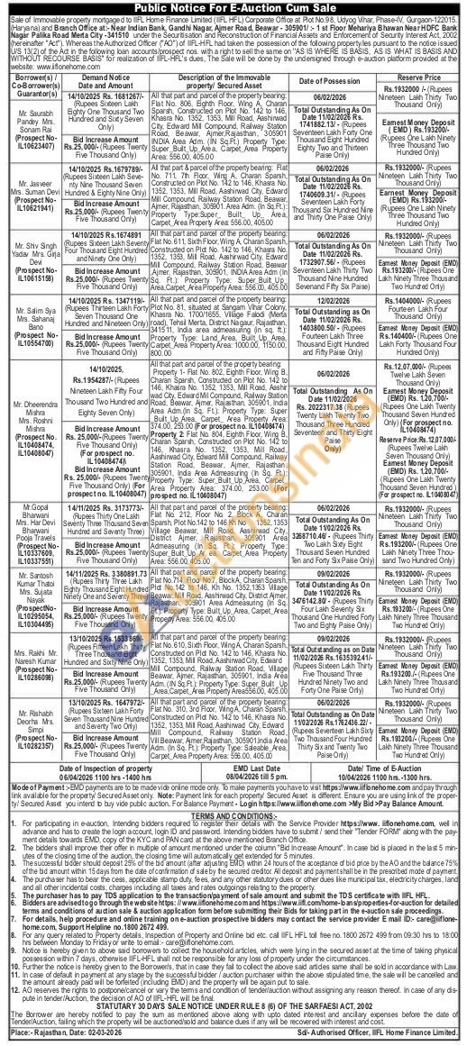 All that part & parcel of the property bearing. Flat No. 711 7th Floor, Wing A. Charan Sparsh. Constructed on Plot No. 142 to 146, Khasra No. 1352, 1353, Mill Road, Aashirwad City, Edward Mill Compound, Railway Station Road, Beawar, Ajmer, Rajasthan, 308901. Area Adm. (in Sq.Ft.): Property Type:Super Built Up Area, Carpet Area Property Area: 556.00, 405.00Rs.1932000