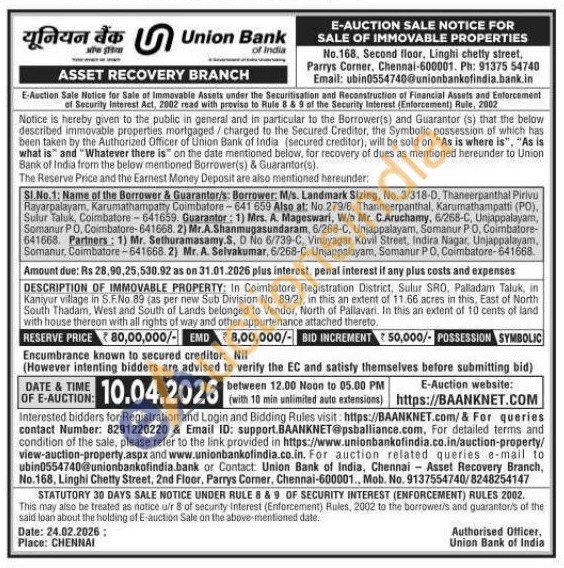 DESCRIPTION OF IMMOVABLE PROPERTY: in Coimbatore Registration District, Sulur SRO, Palladarn Taluk, in Kaniyur village in S.F.No.89 (as per new Sub Division No. 89/2), in this an extent of 11.66 acres in this, East of North South Thadam, West and South of Lands belonged to Vendor, North of Pallavari. In this an extent of 10 cents of land with house thereon with all rights of way and other appurtenance attached thereto