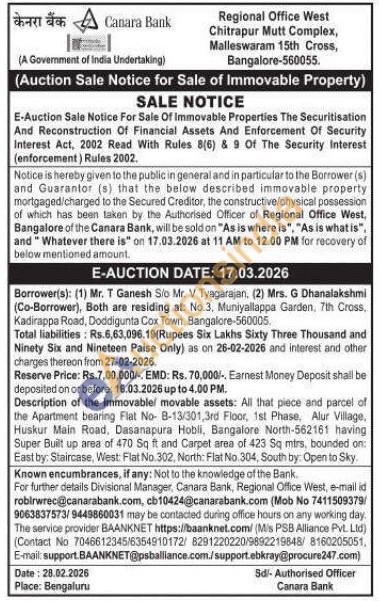 Description of the immovable/ movable assets: All that piece and parcel of the Apartment bearing Flat No- B-13/301,3rd Floor, 1st Phase, Alur Village, Huskur Main Road, Dasanapura Hobli, Bangalore North-562161 having Super Built up area of 470 Sq ft and Carpet area of 423 Sq mirs, bounded on: East by: Staircase, West: Flat No.302, North: Flat No. 304, South by: Open to Sky
