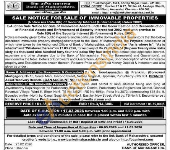 All that piece and parcel of land situated being and lying at Jayamoorthy Raja Nagar in the Puducherry Registration District, Puducherry Sub Registration District, Olandai Revenue Village, Ward K, Block No.6, TS No.1/6/2/1, RS No.45/6pt. Patta No.2073, admeasuring 635 Sq. ft. Bounded on the - North by: Canal, South by: Plot No. 1, East by: New Street, West by: TS No.4/1. Encumbrance: Nil. As known to Bank. Purchasers are requested to verify at your end.