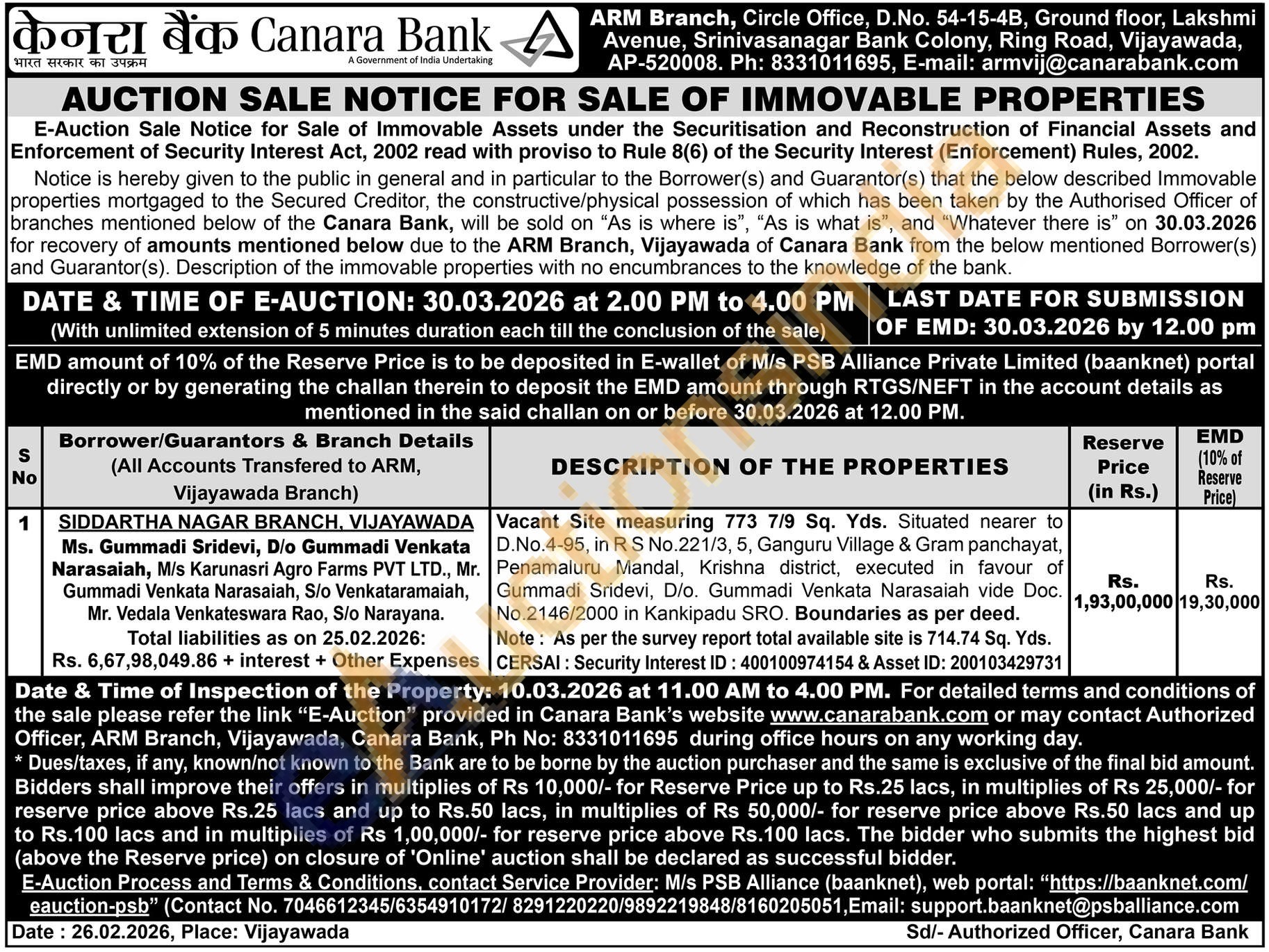 Vacant Site measuring 773 7/9 Sq. Yds. Situated nearer to D.No.4-95, in R S No.221/3, 5, Ganguru Village & Gram panchayat, Penamaluru Mandal, Krishna district, executed in favour of Gummadi Sridevi, D/o. Gummadi Venkata Narasaiah vide Doc. No.2146/2000 in Kankipadu SRO. Boundaries as per deed. Note: As per the survey report total available site is 714.74 Sq. Yds. CERSAI: Security Interest ID: 400100974154 & Asset ID: 200103429731