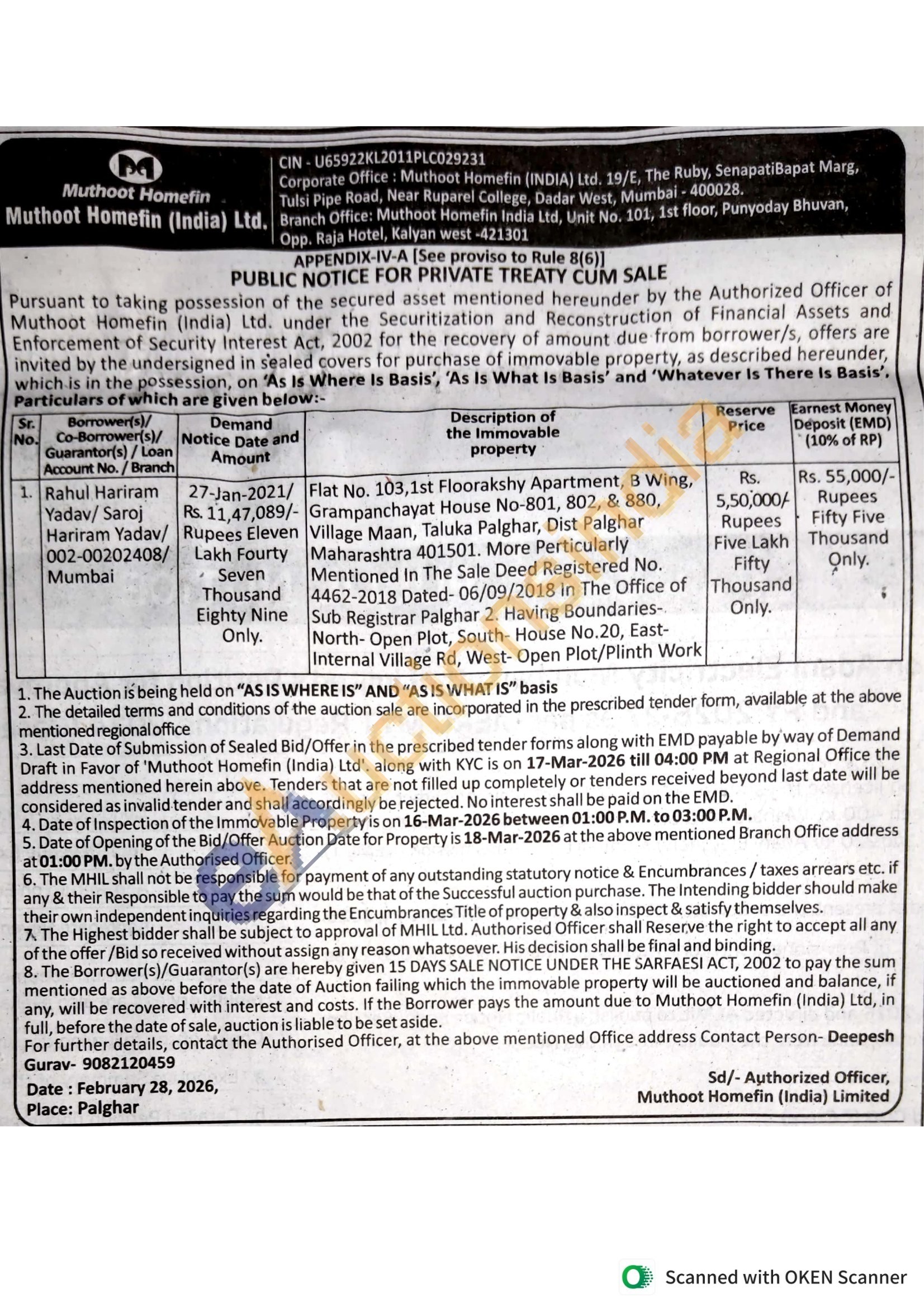 Flat No. 103, 1st Floorakshy Apartment, B Wing, /- Grampanchayat House No-801, 802, & 880, Village Maan, Taluka Palghar, Dist Palghar Maharashtra 401501. More Perticularly Mentioned In The Sale Deed Registered No. 4462-2018 Dated-06/09/2018 In The Office of Sub Registrar Palghar 2. Having Boundaries-North-Open Plot, South- House No.20, East-Internal Village Rd, West- Open Plot/Plinth Work