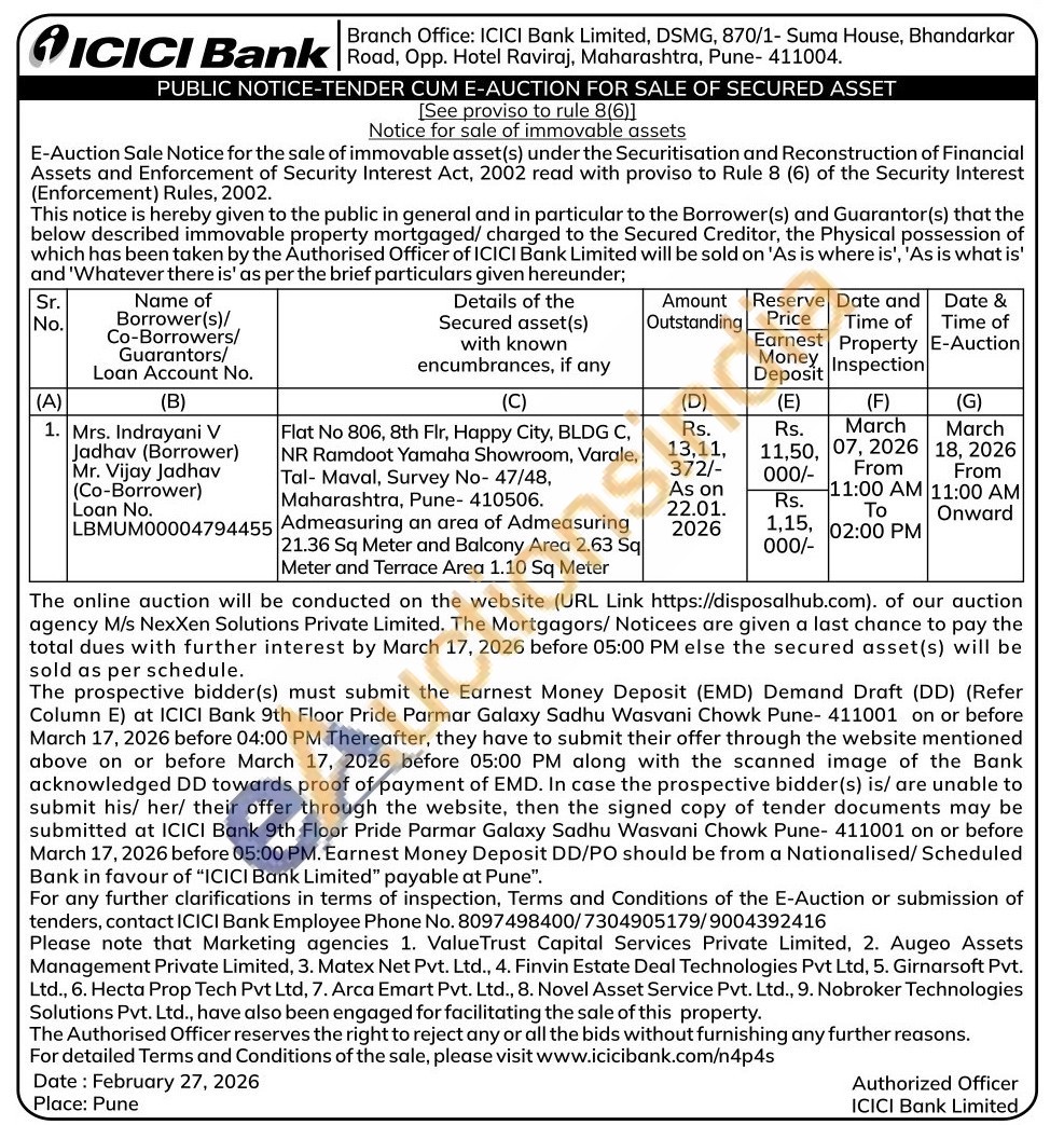 Flat No 806, 8th Flr, Happy City, BLDG C, NR Ramdoot Yamaha Showroom, Varale, Tal- Maval, Survey No- 47/48, Maharashtra, Pune-410506.Admeasuring an area of Admeasuring 21.36 Sq Meter and Balcony Area 2.63 Sq Meter and Terrace Area 1.10 Sq Meter