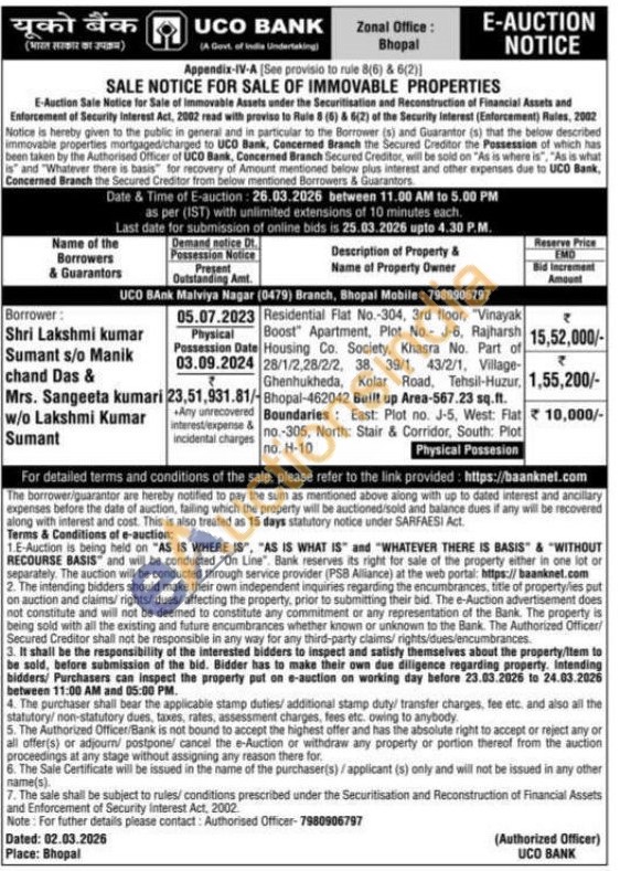 Residential Flat No.-304, 3rd floor, "Vinayak Boost Apartment, Plot No.- J-6, Rajharsh Housing Co. Society, Khasra No. Part of 28/1/2,28/2/2, 38, 39/1, 43/2/1, Village-Ghenhukheda, Kolar Road, Tehsil-Huzur, Bhopal-462042 Built up Area-567.23 sq.ft. Boundaries: East: Plot no. J-5, West: Flat no.-305, North: Stair & Corridor, South: Plot по. Н-10