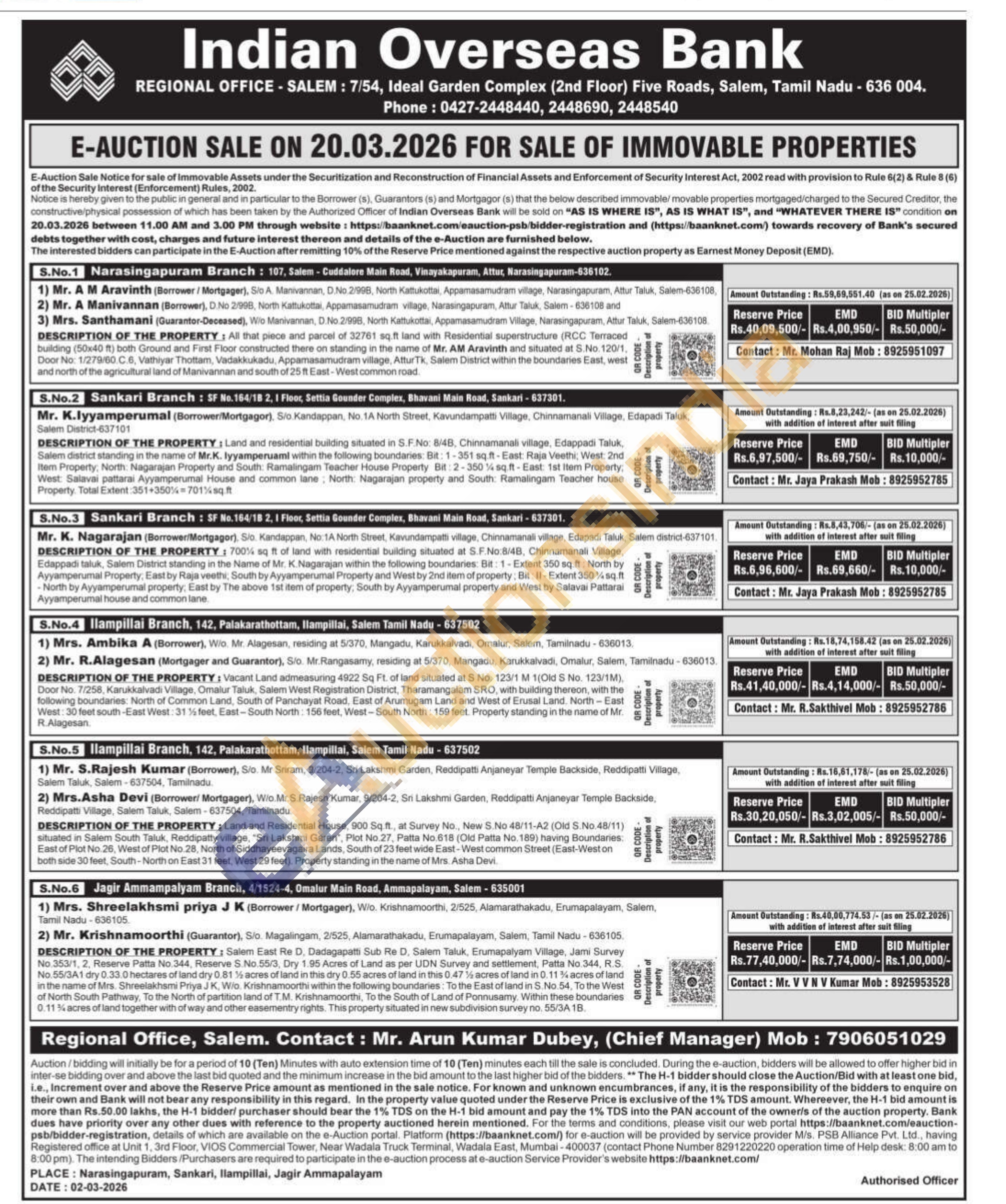 6) Salem East Re D, Dadagapatti Sub Re D, Salem Taluk, Erumapalyam Village, Jami Survey No.353/1, 2, Reserve Patta No.344, Reserve S.No.55/3, Dry 1.95 Acres of Land as per UDN Survey and settlement, Patta No. 344, R.S. No.55/3A1 dry 0.33.0 hectares of land dry 0.81% acres of land in this dry 0.55 acres of land in this 0.47% acres of land in 0.11% acres of land in the name of Mrs. Shreelakhsmi Priya JK, Wio. Krishnamoorthi within the following boundaries: To the East of land in S.No.54, To the West of North South Pathway, To the North of partition land of T.M. Krishnamoorthi, To the South of Land of Ponnusamy. Within these boundaries 0.11% acres of land together with of way and other easementry rights. This property situated in new subdivision survey no. 55/34