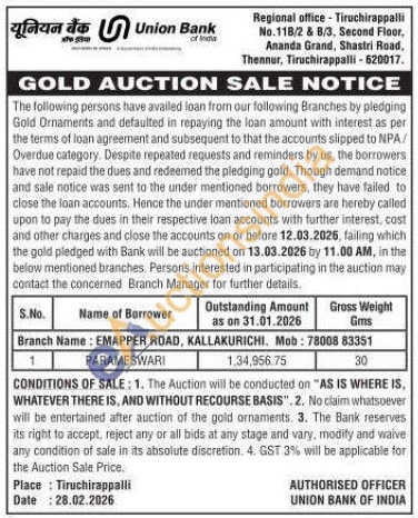 Union Bank of India Gold Auctions Auction in Kallakurichi