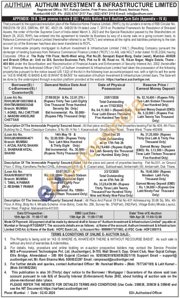 Authorized Officer. Mr. Harshad Mhatre (Mobile No :7977247189) / Lalit Kamat -(Mobile No : 8419982204)