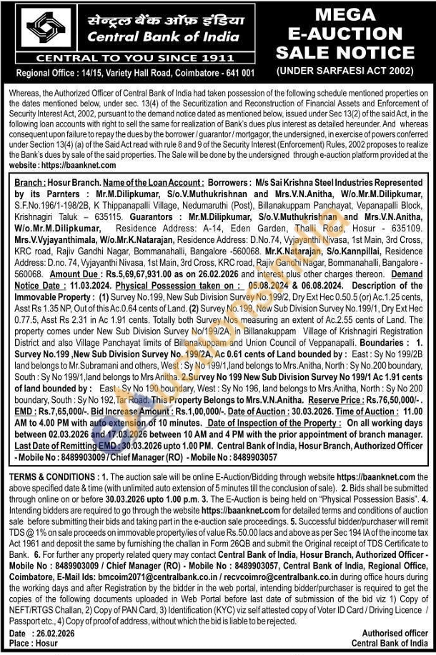 Contact Authorized Officer -Mobile No: 8489903009 / Chief Manager (RO) Mobile No: 8489903057