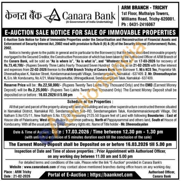 All that part and parcel of the property along with land and building and any other superstructure constructed thereon situated in Namakkal District, Namakkal RD, Sendamangalam Sub-RD, Sendamangalam Taluk, Kondammanaickenpatti Village, Old Natham S.No125/11, New Natham S.No. 125/30 measuring 2125.50 Square feet of Land with following Boundaries: East of House site of Palanisamy, West of South-North common pathway, North of Pappayeammal and others land, South of House of Kondusamy. With all the usual pathway & easementary rights etc. Name of Title holder - Mr. Dheenadayalan