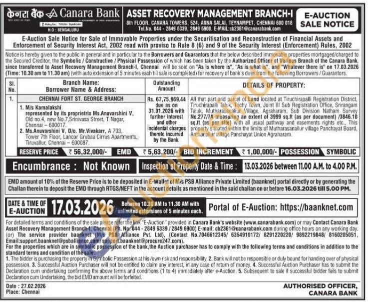 All that part and parcel of Land located at Tiruchirapalli Registration District, Tiruchirapalli Taluk, Trichy Town, Joint III Sub Registration Office, Srirangam Taluk, Mutharasanallur Village, Agraharam, Sub Division Natham Survey No.277/7A measuring an extent of 3999 sq.ft (as per document) /3846.10 sq.ft (as per site) with all usual pathway and easements rights etc. This property situated within the limits of Mutharasanallur village Panchayat Board, Anthanallur village Panchayat Union Agraharam