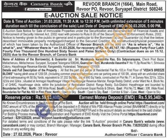 Details and Full Description of the Property: All that the part and parcel of Residential Flat No. 103 in First Floor of "VEDA'S BREEZE BLOWS" having plinth area of 1200 Sft. (Including common area and balconies) one car parking area of 100 Stt, along with an undivided share of land admeasuring 44.50 Sq. Yards, equivalent to 37.202 Sq. Mts, out of 890 Sq Yards, constructed on Plot No 71, in Survey Nos. 321/8, 322/a. 323/a and 324/a, situaled at Anmagal Hayathnagar Vilage, Hayathnagar Revenue Mandal, Ranga Reddy District, under Ward No.4, Block No. 2 of GHMC, Hayathnagar circle, within the jurisdiction of Registration District: Ranga Reddy, Sub-District: Hayathnagar and bounded by Boundaries for Plot: North: 30ft Wide Road, South: Land of Kuncharam Gopal Reddy & Others, East: Plot No. 72, West: 30ft. Wide Road. Boundaries for Flat No. 103 in First Floor, North: Open to Sky South: Open to Sky, East: Corridor & Stair-Case, West: Open to Sky