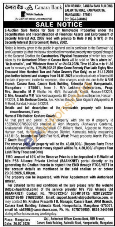 All that part and parcel of the property with site no 8 property id 152200200705020123 situated at Yesh Megacity (Aishwarya Gardens), Anakanahalli Village, Manuganahalli GP, Billikere Hobli, Adjacent to Mysore Hunsur road, Hunsur Taluk, Mysore District, Karnataka totally measuring 413.01 Sq. bounded on East: Plot No 9, West: Private property, North: Plot No 7, South: Road