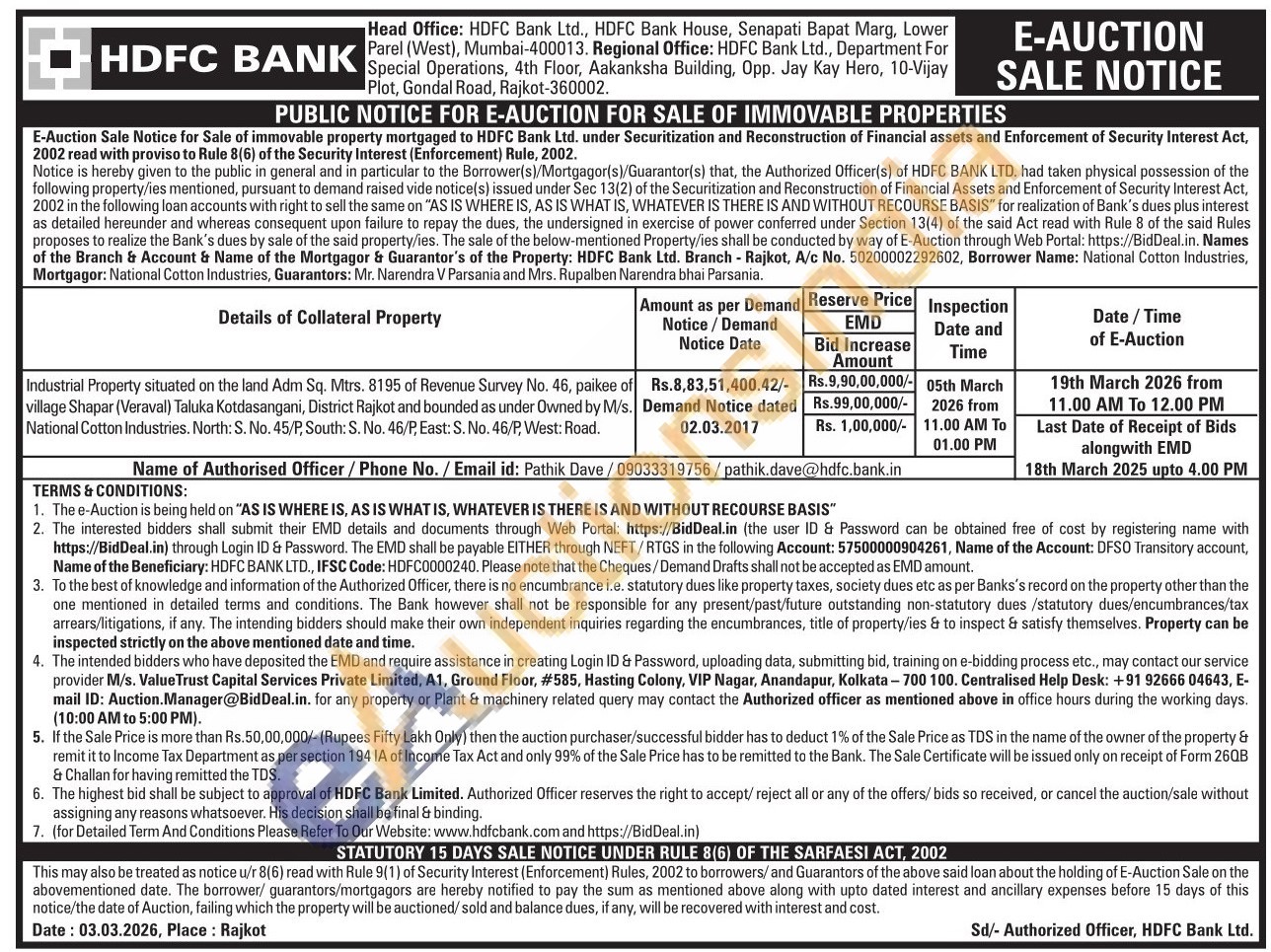 Contact Authorised Officer/ Phone No./ Email id: Pathik Dave/09033319756/pathik.dave@hdfc.bank.in