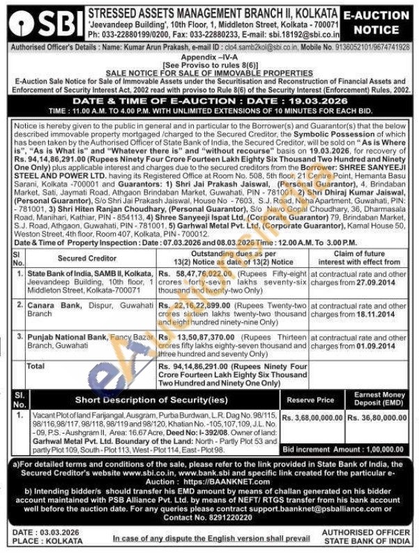 Contact Authorised Officer's Details: Name: Kumar Arun Prakash, e-mail ID: clo4.samb2kol@sbi.co.in, Mobile No. 9136052101/9674741928