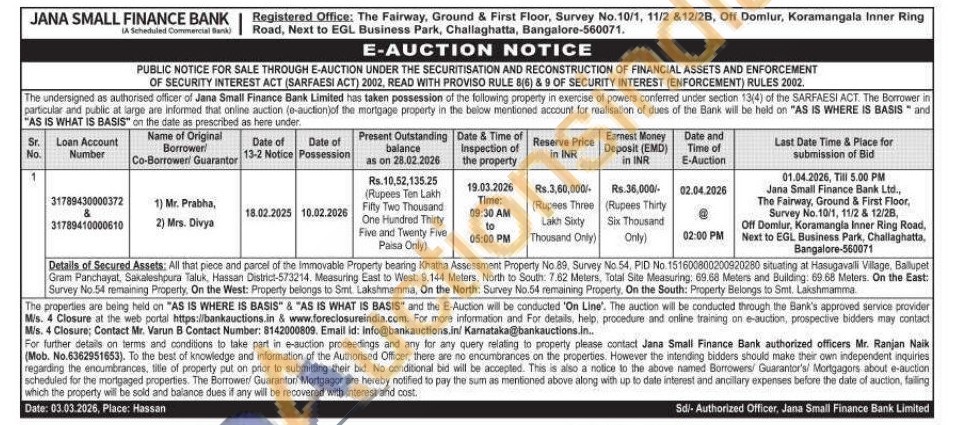 All that piece and parcel of the immovable Property bearing Khatha Assessment Property No 89, Survey No. 54, PID No. 151600800200920280 situating at Hasugavalli Village, Ballupet Gram Panchayat, Sakaleshpura Taluk, Hassan District-573214. Measuring East to West: 9.144 Meters, North to South: 7.62 Meters, Total Site Measuring: 69.68 Meters and Building: 69.68 Meters. On the East: Survey No.54 remaining Property, On the West: Property belongs to Smt Lakshmamma, On the North: Survey No.54 remaining Property. On the South: Property Belongs to Smt. Lakshmamma.