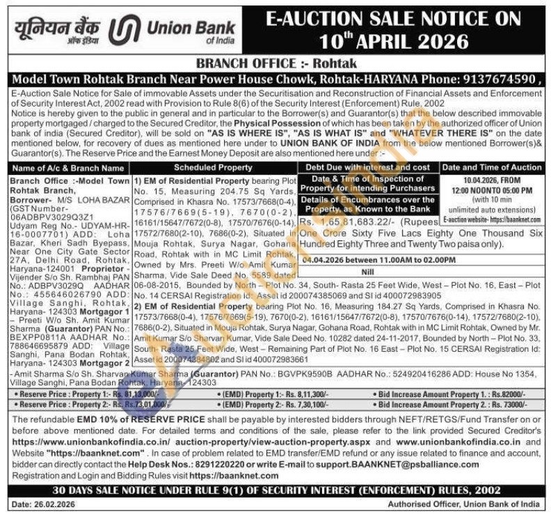 1) EM of Residential Property bearing Plot No. 15. Measuring 204,75 Sq YardsComprised in Khasra No. 17573/7668(0-4) 17576/7669(5-19), 7670(0-2) 16161/15647/7672(0-8), 17570/7676(0-14) 17572/7680(2-10), 7686(0-2), Situated in Mouja Rohtak, Surya Nagar, GohanaRoad, Rohtak with in MC Limit Rohtak Owned by Mrs. Preeti W/o Amit Kumar Sharma, Vide Sale Deed No. 5589 dated Nill 06-08-2015, Bounded by North-Plot No. 34, South- Rasta 25 Feet Wide, West-Plot No. 16. East-Plot No. 14 CERSAI Registration Id: Asset id 200074385069 and SI id 400072983905