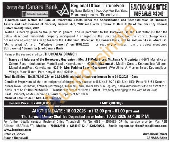 All the part and parcel of the property situated at R.S No 318/2C4, Old S No 1500, Patta No 6154, Kumara-puram Town Panchayat, Kothanalloor Village, Kalkulam Taluk, Thuckalay Sub Registry, Kanyakumari District to an extent of 5 cents (2178 Sq Ft) BOUNDARIES: North: Property of Mr Ismail West: Property belonging to the wife of Mr Jude East: Property of Mrs Shipinisha South: Property of Mr Nazer Name of Title Holder: Mrs.Fathima Beevi