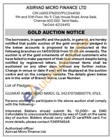 Asirvad Micro Finance Ltd Gold Auctions Auction in Ahmedabad