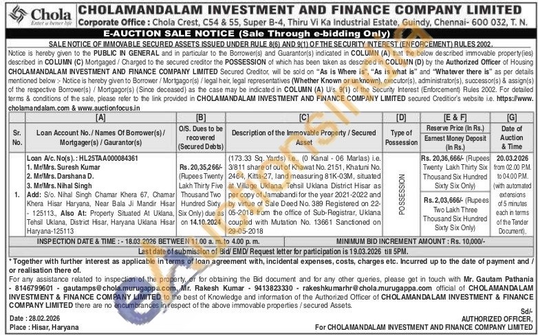 (173.33 Sq. Yards) i.e., (0 Kanal 06 Marlas) l.e. 3/811 share of out of Khawat No. 2151, Khatuni No. 2464, Kitta-27, land measuring 81K-03M, situated at Village Uklana, Tehsil Uklana District Hisar as per copy of Jamabandi for the year 2021-2022 and by virtue of Sale Deed No. 389 Registered on 22-05-2018 from the office of Sub-Registrar, Uklana coupled with Mutation No. 13661 Sanctioned on 29-05-2018