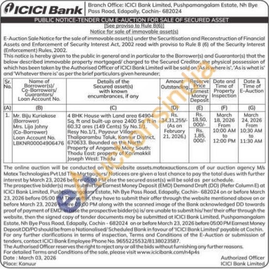 4 BHK House with Land area 64904 Sq. ft and built-up area 2400 Sq. ft in 60.32 ares (149 Cents) Sy No.1/1. Resy No. 1/1, Payavur Village, Thaliparambu Taluk, Kannur District, 670633. Bounded on the North: Property of Angamaly Mary South: Thodu East: property of Karimakkil Joseph West: Thodu