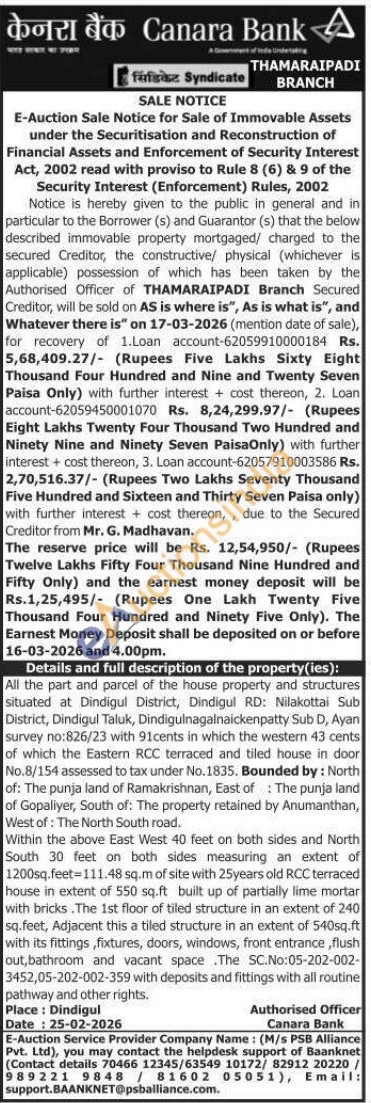 All the part and parcel of the house property and structures situated at Dindigul District, Dindigul RD: Nilakottai Sub District, Dindigul Taluk, Dindigulnagalnaickenpatty Sub D, Ayan survey no:826/23 with 91cents in which the western 43 cents of which the Eastern RCC terraced and tiled house in door No.8/154 assessed to tax under No. 1.835. Bounded by: North of: The punja land of Ramakrishnan, East of The punja land of Gopaliyer, South of: The property retained by Anumanthan, West of: The North South road.