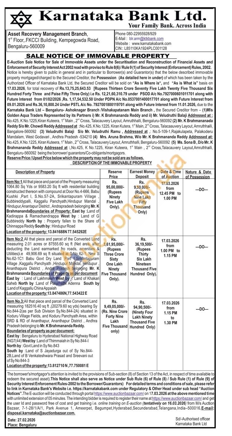 Item No:2 All that piece and parcel of the Converted Land measuring 2.01 acres or 87555.60 sq ft (Net area, after deducting the Land earmarked fro roads, amenities & Utilities)i.e 49.906.69 sq ft situated at S.No 62-1, New S No.62-1C1 Babu Govt Dry Land Part 1, Srikantapuram Village Kaggallu Panchyath Hindupur Mandal, Hindupur Ananthapura District, Andra Pradesh belonging Mr. K Brahmananda Boundaries of Property as per document East by Land of Lakhmaiah West by Land of Khakari Saheb North by Land of Pullamathi Adenna South by Land of Kaggallu China Appaiah