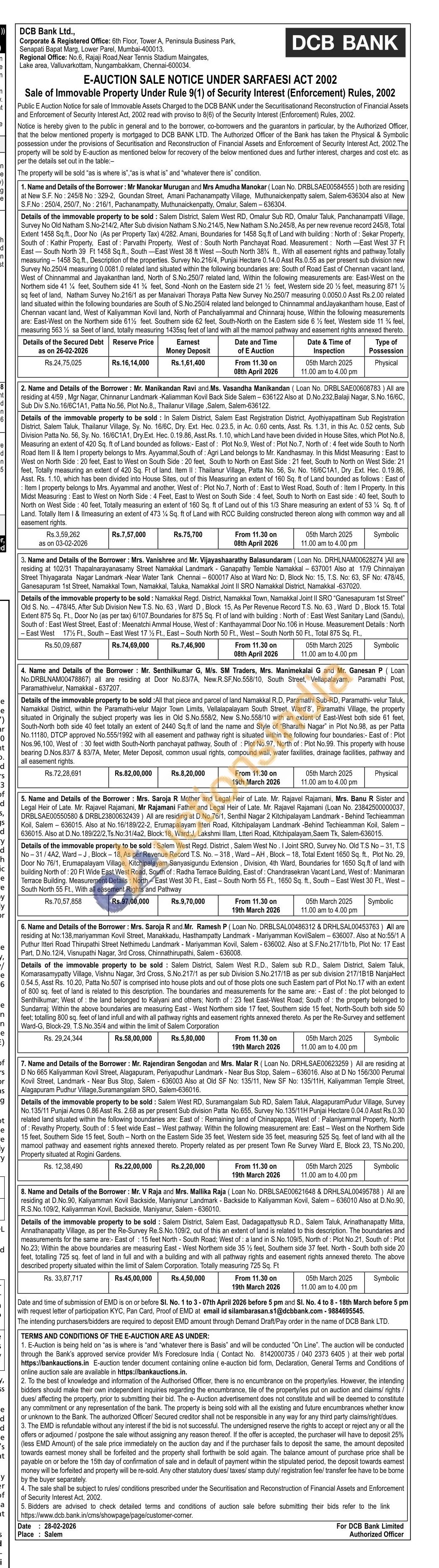 Details of the immovable property to be sold: Namakkal Regd. District, Namakkal Town, Namakkal Joint II SRO "Ganesapuram 1st Street" Old S. No.-478/45, After Sub Division New T.S. No. 63, Ward D, Block 15, As Per Revenue Record T.S. No. 63, Ward D, Block 15. Total Extent 875 Sq. Ft., Door No (as per tax) 6/107.Boundaries for 875 Sq. Ft of land with building: North of: East West Sanitary Land (Sandu), South of: East West Street, East of: Meenatchi Ammal House, West of: Kanthayammal Door No. 106 in House. Measurement Details: North -East West 17% Ft., South-East West 17½ Ft., East-South North 50 Ft., West-South North 50 Ft., Total 875 Sq. Ft