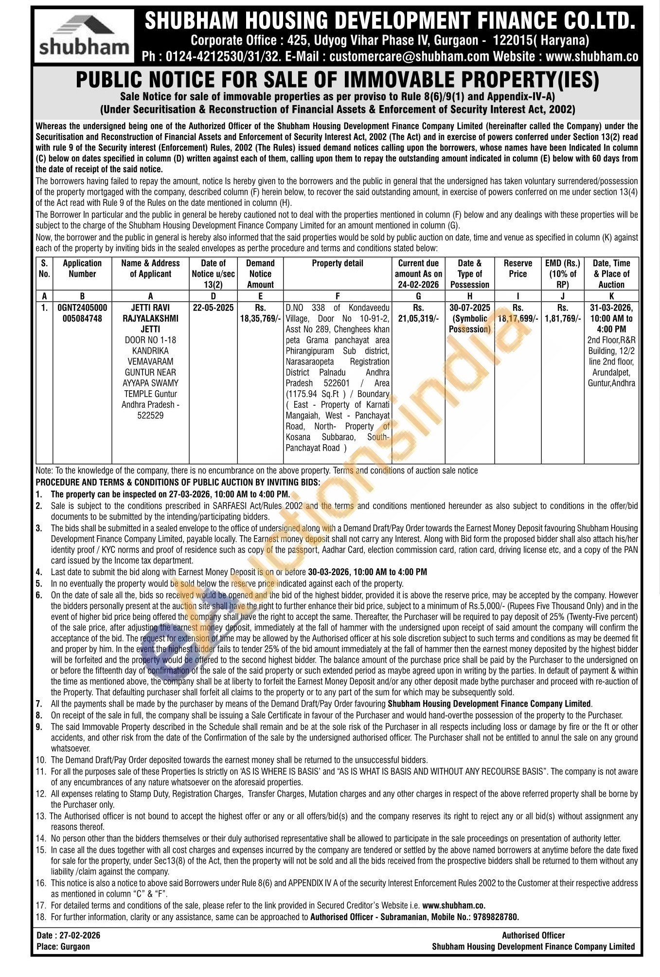 Authorised Officer - Subramanian, Mobile No.: 9789828780