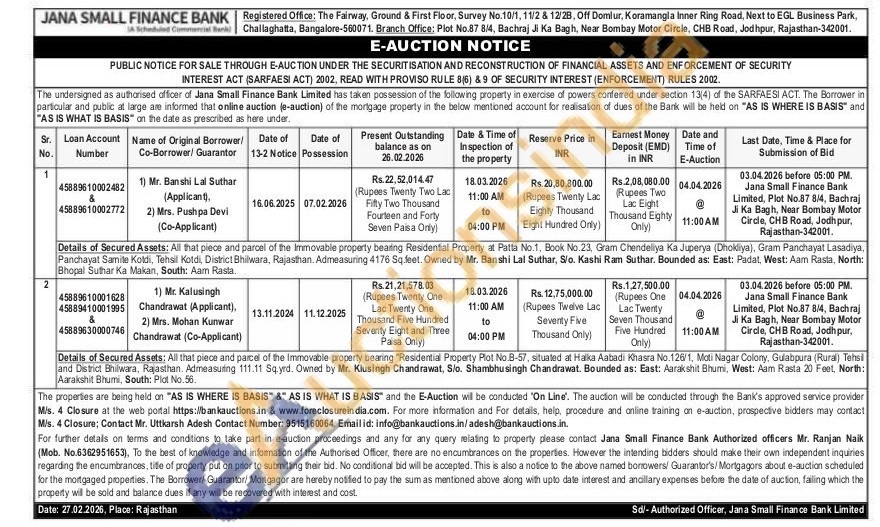 Details of Secured Assets: All that piece and parcel of the Immovable property bearing "Residential Property Plot No.B-57, situated at Halka Aabadi Khasra No.126/1, Moti Nagar Colony, Gulabpura (Rural) Tehsi and District Bhilwara, Rajasthan. Admeasuring 111.11 Sq.yrd. Owned by Mr. Klusingh Chandrawat, S/o. Shambhusingh Chandrawat. Bounded as: East: Aarakshit Bhumi, West: Aam Rasta 20 Feet, North: Aarakshit Bhumi, South: Plot No.56.