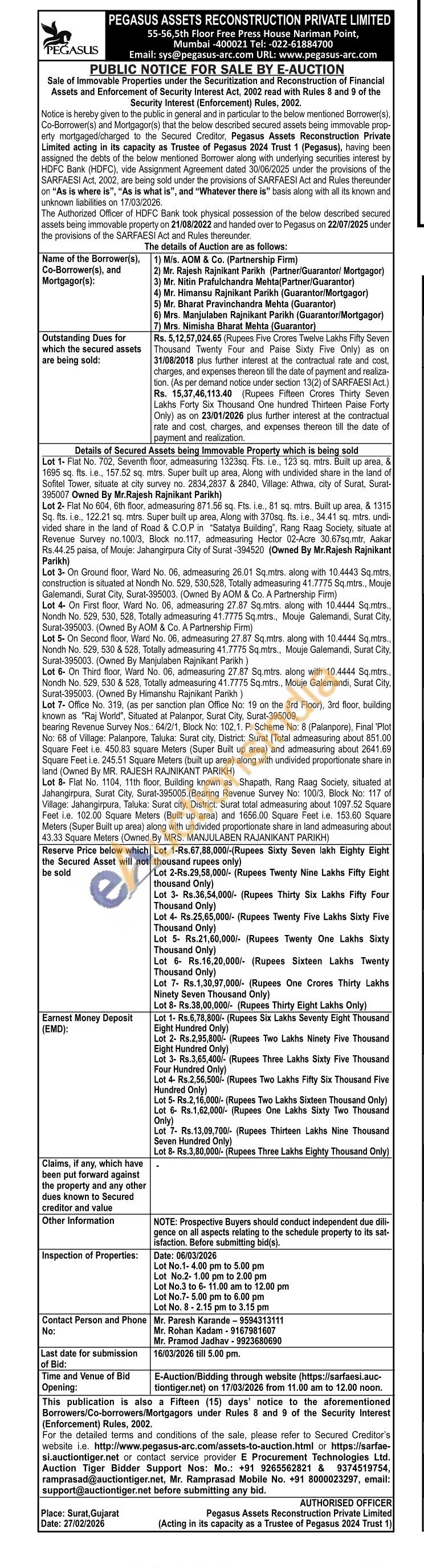 bearing Revenue Survey Nos.: 64/2/1, Block No: 102,1. P. Scheme No: 8 (Palanpore), Final "Piot No: 68 of Village: Palanpore, Taluka: Surat city, District: Surat [Total admeasuring about 851.00 Square Feet i.e. 450.83 square Meters (Super Built up area) and admeasuring about 2641.69 Square Feet i.e. 245.51 Square Meters (built up area) along with undivided proportionate share in land (Owned By MR. RAJESH RAJNIKANT PARIKH