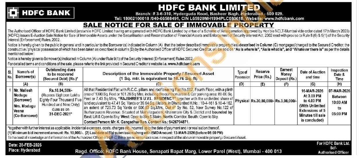 All that Residential Flat with R.C.C. pillars and roof bearing Flat No.502, Fourth Floor, with a plinth area of 1090 Sq. Feet or 101.26 Sq Mtrs, including the common areas & Car parieng area: 80-00 Sq Feet or 7.43 Sq Mtrs, "RAJSHREE'S U.V.L. RESIDENCY" together with the undividec share of land equivalent to 47.41 Sq. Yards or 39.64 Sq. Meters, in Dismantled H.No. 10-4-161 & 10-4-162 an extent of 725.73 Sq Yards or 606.80 Sq.Mtrs, Out of Sy No. 52, New Survey No. 122 of Burhanpuram Revenue, Situated at Mamillagudem, Khammam City & District and bounded by East: Lift & Open to Sky West: Open to Sky & Stairs, North: Corridor South: Open to Sky Contact Person: Mr. K. Gangadhar Rao, Contact No.: 9426794871