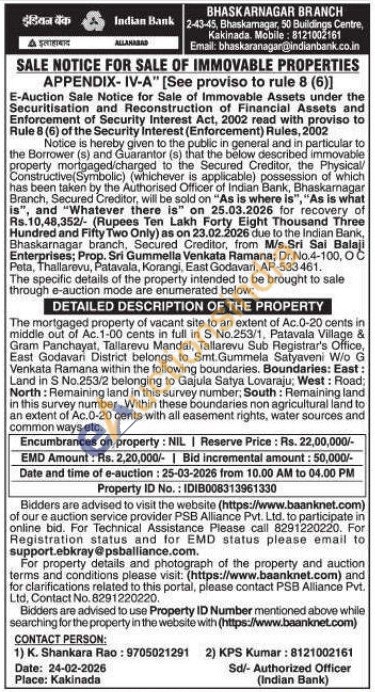 The mortgaged property of vacant site to an extent of Ac.0-20 cents in middle out of Ac.1-00 cents in full in S No.253/1, Patavala Village & Gram Panchayat, Tallarevu Mandal, Tallarevu Sub Registrar's Office, East Godavari District belongs to Smt.Gummela Satyaveni W/o G Venkata Ramana within the following boundaries. Boundaries: East: Land in S No.253/2 belonging to Gajula Satya Lovaraju; West: Road: North: Remaining land in this survey number; South: Remaining land in this survey number. Within these boundaries non agricultural land to an extent of Ac.0-20 cents with all easement rights, water sources and common ways etc