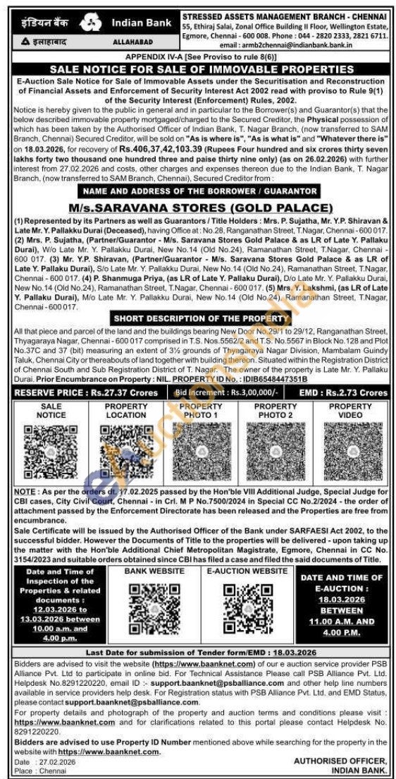 All that piece and parcel of the land and the buildings bearing New Door No.29/1 to 29/12, Ranganathan Street. Thyagaraya Nagar, Chennai-600017 comprised in T.S. Nos. 5562/2 and T.S. No.5567 in Block No. 128 and Plot No.37C and 37 (bit) measuring an extent of 3% grounds of Thyagaraya Nagar Division, Mambalam Guindy Taluk, Chennai City or thereabouts of land together with building thereon. Situated within the Registration District of Chennai South and Sub Registration District of T. Nagar. The owner of the property is Late Mr. Y. Pallaku Durai. Prior Encumbrance on Property: NIL PROPERTY ID No.: IDIB65484473518