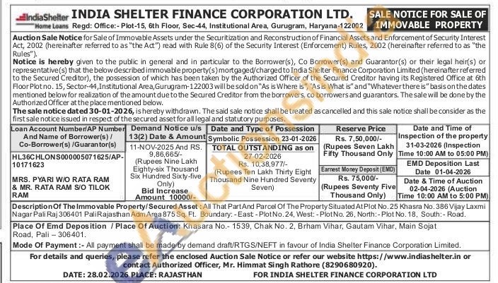 Description Of The Immovable Property/Secured Asset: All That Part And Parcel Of The Property Situated At Plot No. 25 Khasra No. 386 Vijay Laxmi Nagar Pali Raj 306401 Pali Rajasthan Adm Area 875 Sq. Ft. Boundary:-East-Plot No. 24, West: -Plot No. 26, North:-Plot No. 18, South:-Road