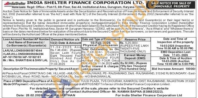 Description Of The Immovable Property/Secured Asset: All Piece And Parcel Of PATTANO.046, VILLAGE-AMLOOI, GP-RAJYAVAS, PS-RAJSAMAND, Distt.-RAJSAMAND, 313342 RJ BOUNDARY:-East-H/O BABULAL, West-ROAD, North-H/O CHOGALAL, South-H/O BHAGWAN LAL