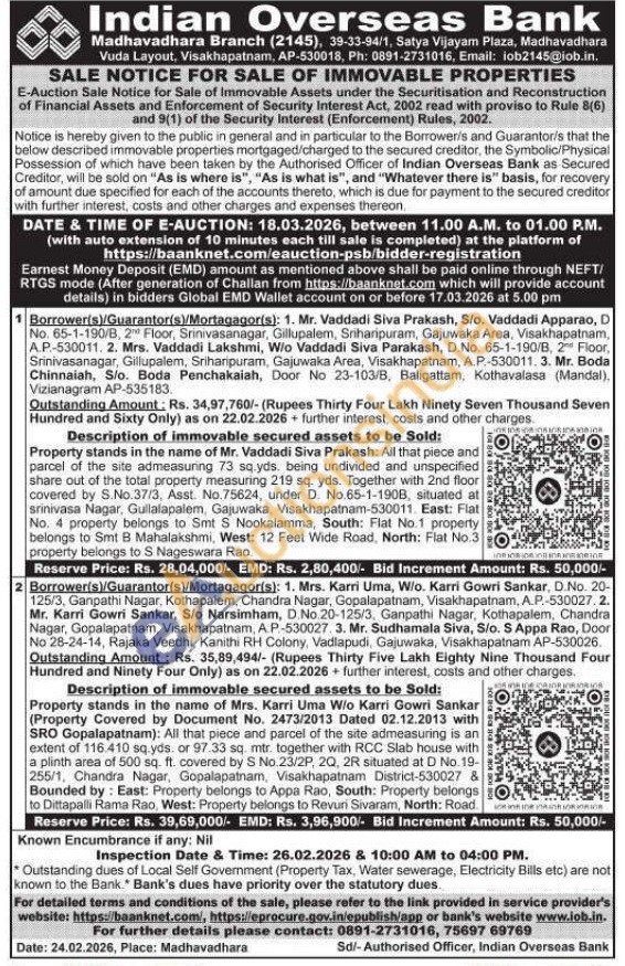 Description of immovable secured assets to be Sold: Property stands in the name of Mrs. Karri Uma W/o Karri Gowri Sankar (Property Covered by Document No. 2473/2013 Dated 02.12.2013 with SRO Gopalapatnam): All that piece and parcel of the site admeasuring is an extent of 116.410 sq.yds. or 97.33 sq. mtr. together with RCC Slab house with a plinth area of 500 sq. ft. covered by S No.23/2P, 2Q, 2R situated at D No.19-255/1, Chandra Nagar, Gopalapatnam, Visakhapatnam District-530027 & Bounded by: East: Property belongs to Appa Rao, South: Property belongs to Dittapalli Rama Rao, West: Property belongs to Revuri Sivaram, North: Road