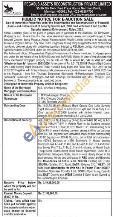 ALL THAT Unit No.ll bearing GHMC No 4-3-448 TO 460 & 4-3-465 TO 468/UNIT-MV, in Fourth Floor in the building complex known as "VINOOTHNA PITTIE'S MAJESTY", admeasuring 5722 Stt, of Plinth area (including common areas) and five car parkings area 600 Stt, together with undivided share of land admeasuring 195.80 Sq yards or 163:59 Sq.mtrs, out of total land admeasur ing 4970.5 Sq yards or 4156 Sq.meters, in House bearing Municipal Nos.4-3-448 to 460 and 4-3-465 to 468, on Land bear-ing Survey Plot TSLR. No.2, 5 and 6, situated at Gopal Bagh, Troop Bazar, Sultan Bazar, Bank Street, Hyderabad, under R.O. Hyderabad, Telangana State, which is more clearly shown in the plan annexed hereto and delinested in RED colour and Bounded by Boundaries for Entire Land: NORTH Existing C.C. Road, SOUTH:- Existing CC. Road, EAST: Existing C.C. WEST:- 30 wide Road Boundaries for Unit No.ll in Fourth Floor NORTH Unit No.1, Staircase, Corridor & Lift, SOUTH Open to sky, Open to sky, EAST Open to sky, WEST Corridor & Open to sky Owned by Mr Pandurangam Chedupu