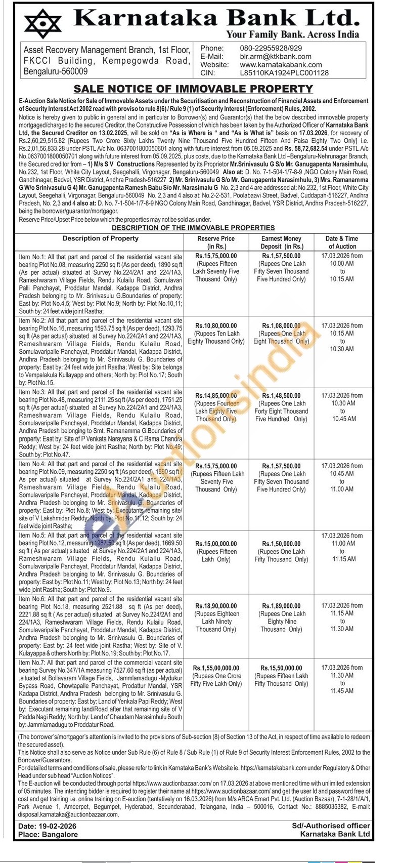 Item No.6: All that that part and parcel of the residential vacant site bearing Plot No.18, measuring 2521.88 sq ft (As per deed). 2221.88 sq ft (As per actual) situated at Survey No.224/2A1 and 224/1A3, Rameshwaram Village Fields, Rendu Kulailu Road, Somulavaripalle Panchayat, Proddatur Mandal, Kadappa District, Andhra Pradesh belonging to Mr. Srinivasulu G. Boundaries of property: East by: 24 feet wide joint Rastha; West by: Site of V Kulayappa & others North by: Plot No. 19; South by: Plot No. 17