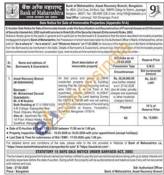 All that piece and parcel of 2BHK residential property (land & building) bearing Flat No. 104 admeasuring built-up area 1200 sq. ft on 1st Floor in the Apartment named "AMACO ALASKA Constructed on the Land bearing Survey No. 136/3A & 136/38 with one car parking and 8.33% undivided share of the land lying and situated at Kaana, Hosabatlu, Surathkal, Mangalore-575014