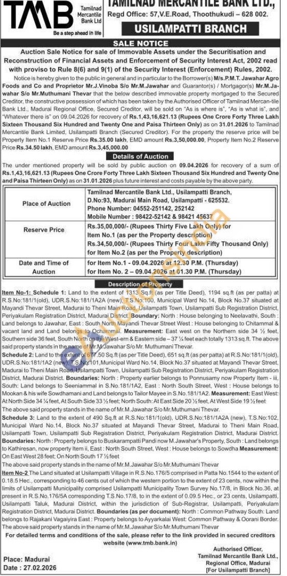 Item No-2 The Land situated at Usilampatti Village in R.S.No. 176/5 comprised in Patta No. 1544 to the extent of 0.18.5 Hec, corresponding to 46 cents out of which the westem portion to the extent of 23 cents, now within the limits of Usilampatti Municipality comprised Usilarnpatti Municipality Town Survey No. 17/8, in Block No.36, at present in R.S.No. 176/5A corresponding T.S.No. 17/8, to in the extent of 0.09.5 Hec, or 23 cents, Usilampatti, Usilampatti Taluk, Madurai District, within the jurisdiction of Sub-Registrar. Usilampatti, Periyakulam Registration District, Madurai District. Boundaries (as per document): North: Common Pathway South: Land belongs to Rajakani Vagaiyira East: Property belongs to Ayyarkalai West: Common Pathway & Corani Border. The above said property stands in the name of Mr.M.Jawahar Sio Mr. Muthumani Thevar