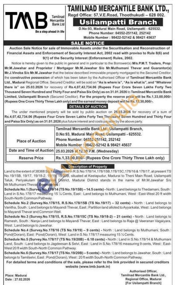 Land to the extent of 38368 Sq.ft comprised in R.S.No:178/14,178/158,178/150.178/16 & 178/17, at present TS No. 19/158, 19/17, 19/18-2, 19/19, 19/20B, situated at Keelapudur, Madurai to Theni Main Road, Usilampatti Taluk, Periyakulam Registration District, Madurai District stands in the name of Mr.M.Jawahar Sio Mr.Muthumani Thevar, Boundaries: Schedule No.1 (Survey.No.178/14 (TS No. 19/158)-14.5 cents)-North: Land belongs to Thedamani, South: Land in S.No. 178/17 measuring 15% Cents, East: Land belongs to Muthumani, West: East-West 20 ft width South-North Common Pathway. Schedule No.2 (Survey.No.178/15, R.S.No.178/15B (TS No.19/17)-32 cents) North Land belongs to Vanitha, South: Land belongs to Mayandi Thevar, East: Partition land alloted to Ayyarkalai, West: Land belongs to Mayandi Thevar and Common Well. Schedule No.3 (Survey.No.178/15, R.S.No. 178/15C (TS No.19/18-2)-21 cents)-North: Land belongs to Ramesh, South: Nanja Land belongs to Mayandi Thevar, East: Land belongs to Raja @ Veeranan Vagaiyara, West: Land belongs to Jawahar Schedule No.4 (Survey. No.178/16 (TS No.19/19)-9 cents) North: Land belongs to Muthumani, South Pond(Corani), East: Pond(Oorani), West: Land in S.No. 178/17 measuring 15% Cents. Schedule No.5 (Survey. No. 178/17 (TS No.19/20B)-6.18 cents)-North: Land in S.No. 178/14 & Muthumani Land, South: Land belongs to Jagdeesan & Selvi, East: Land in S.No. 178/16 measuring 9 cents, West: East-West 20 ft width South-North Common Pathway. Schedule No.6 (Survey.No.178/17 (TS No. 19/20B)-5 cents)-North: Land belongs to Jawahar, South: Land belongs to Tamilselvi, East: Pond(Oorani), West: 20 ft width South-North Common Pathway. For detailed terms and conditions of the sale, please refer to the link provided in secured creditors