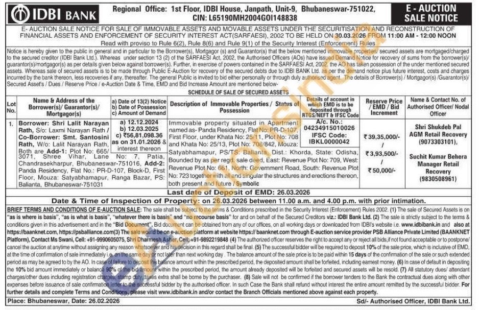 Immovable property situated in Apartment First Floor, under Khata No: 25/11, Plot No: 708 & and Khata No: 25/13, Plot No: 708/842, Mouza: Satyabhamapur, PS/TS: Balianta, Dist.: Khorda, State: Odisha, Bounded by as per regd. sale deed, East: Revenue Plot No: 709, West: Revenue Plot No: 661, North: Government Road, South: Revenue Plot No: 723 together with all and singular the structures and erections thereon, both present and future / Symbolic