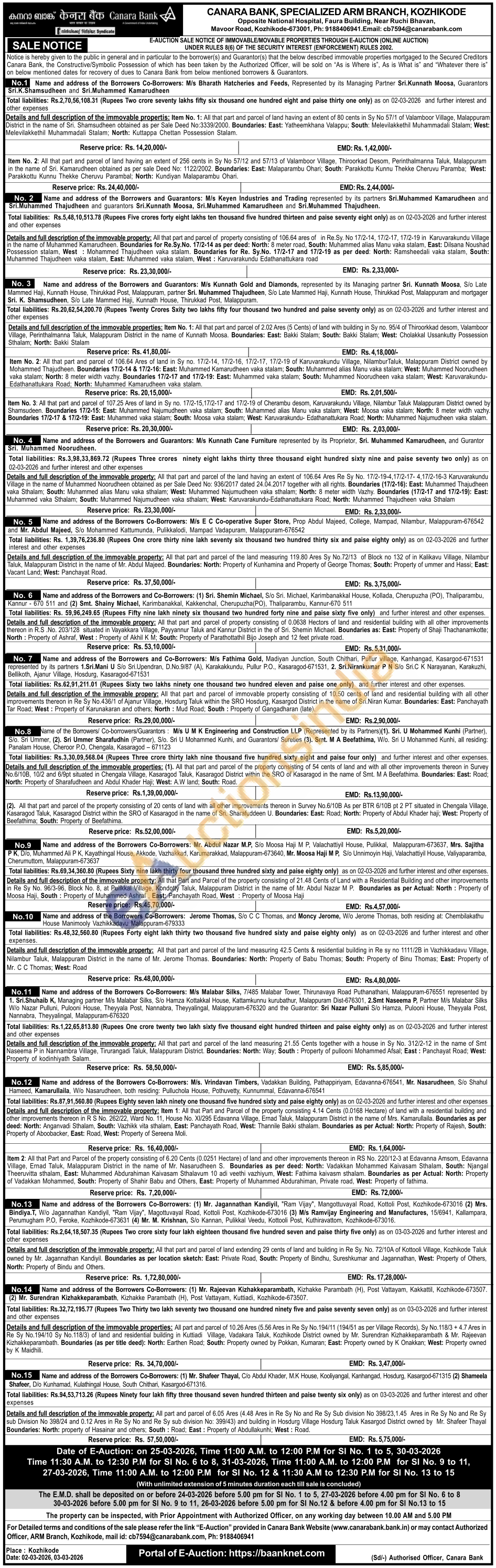 Details and full description of the immovable propery: All that part and parcel of property consisting of 0.0638 Hectors of land and residential building with all other improvements thereon in R.S.No. 203/128 situated in Vayakkara Village, Payyannur Taluk and Kannur District in the of Sri. Shemin Michael. Boundaries as: East: Property of Shaji Thachanamkotte; North Property of Ashraf, West: Property of Akhil K M; South: Property of Parathottathil Bijo Joseph and 12 feet private road.