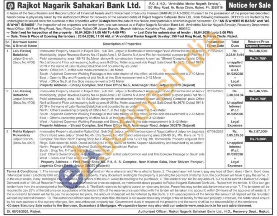 Immovable Property situated in Rajkot Dist., Sub Dist. Jetpur, with in the boundary of Nagarpalika of Jetpur on Jagavala Chora Road area Jetpur Sheet No.45, City Survey No.4573 land admeasuring area 236-90 Sq. Mtr. there on "S.S. Complex" first floor North Facing Shop No.F-8 which Built-up area 12-91 Sq. Mtr. Immovable Property acquired Vide Regd. Sale deed No. 1059, Dated 02/03/2012 in the Name of Mehta Kalpesh Mukundray and bounded by as under: North: Property of Miraji's Medivali Gulhamidkhan Jamalkhan Pathan South: Shop No. F-7 and this side Common Wall East: Other's Owner Shop No.9 on North side Portion at that side Common wall and This Complex Passage on South side West Stairs and Then after Downside Road Property Address: First Floor, Shop No. F-8, S. S. Complex, Near Kishan Sabu