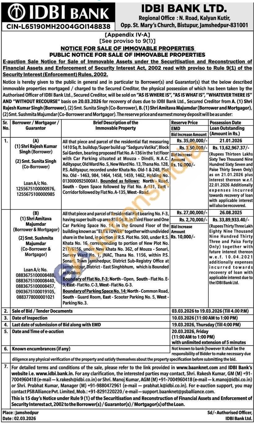 All that piece and parcel of the residential flat measuring 14105q.ft. buildup/Super build up "Sadguru Vatika", Block Sai Garden, bearing proposed Flat No. A-136 in the 1st Floor with Car Parking situated at Mouza Dindli, N.A.C. Adityapur, Old Ward No. 5, New Ward No. 13, Thana No. 128, P.S. Adityapur, recorded under Khata No. Old-1 & 248, Plot No. Old-1463, 984, 1464, 1458, 1459, 1462, Holding No. 0130000925000A1. Bounded as follows: North Road, South Open Space followed by Flat No. A-131, East -Corridor followed by Flat No.A-135, West-Road.
