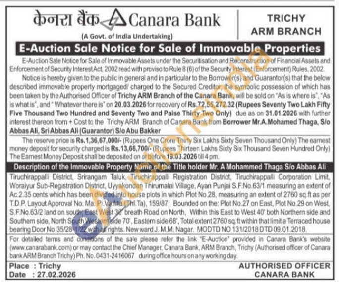 Tiruchirappalli District, Srirangam Taluk, Tiruchirappalli Registration District, Tiruchirappalli Corporation Limit, Woraiyur Sub-Registration District, Uyyakondan Thirumalai Village, Ayan Punjai S.F.No.63/1 measuring an extent of Ac.2.35 cents which has been divided into house plots in which Plot No.28, measuring an extent of 2760 sq.ft as per T.D.P. Layout Approval No. Ma. Pl.Va.Ma. (Thi. Ta), 159/87. Bounded on the: Plot No.27 on East, Plot No.29 on West, S.F.No.63/2 land on south, East West 30' breath Road on North, Within this East to West 40' both Northern side and Southern side, North South Westem side 70', Eastem side 68', Total extent 2760 sq.ft within that limit a Terraced house bearing Door No.35/28-1/22 with all rights. New ward J. M.M. Nagar. MODTD NO 131/2018 DTD 09.01.2018