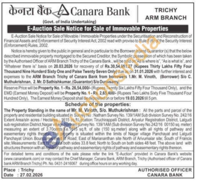 The Property Standing in the name of Mr. M. Vinoth, S/o. Muthukrishnan: All the parts and parcel of the property and residential building situated in Survey No: Natham Survey No. 139/1AM Sub division Survey No. 242/16 Extent Area/sin acres/Hectares: 1615 sq.ft Location: Tiruchirappalli District, Ariyalur Registration District, Lalgudi sub registration District Nagar village Natham survey No. 139/1AM (Sub division Survey No.242/16 00150 sq. meter) measuring an extent of 3.70cents ie.1615 sq.ft. of site (150 sq.meter) along with all rights of pathway and easementary rights thereon. The property is situated within the limits of Nagar village Panchayat and Lalgudi Panchayat Union. Boundaries West of Road, East of Mariananthan site North of Arivumalar site, South of Francis site: Measurements: East to Weston both sides 33.8 feet, North to South on both sides 48 feat. The above land with structures thereon with all rights of pathway and easementary rights of pathway and easementary rights thereon.
