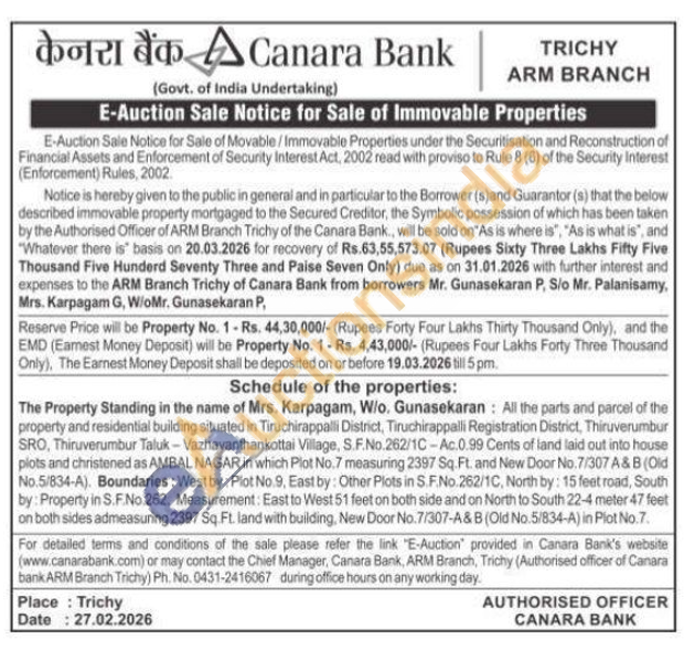 The Property Standing in the name of Mrs. Karpagam, W/o. Gunasekaran: All the parts and parcel of the property and residential building situated in Tiruchirappalli District, Tiruchirappalli Registration District, Thiruverumbur SRO, Thiruverumbur Taluk-Vazhavanthankottai Village, S.F.No.262/1C-Ac.0.99 Cents of land laid out into house plots and christened as AMBAL NAGAR in which Plot No.7 measuring 2397 Sq. Ft. and New Door No.7/307 A & B (Old No.5/834-A). Boundaries: West by: Plot No.9, East by: Other Plots in S.F.No.262/1C, North by: 15 feet road, South by: Property in S.F.No.262. Measurement: East to West 51 feet on both side and on North to South 22-4 meter 47 feet on both sides admeasuring 2397 Sq Ft. land with building, New Door No. 7/307-A&B (Old No.5/834-A) in Plot No.7