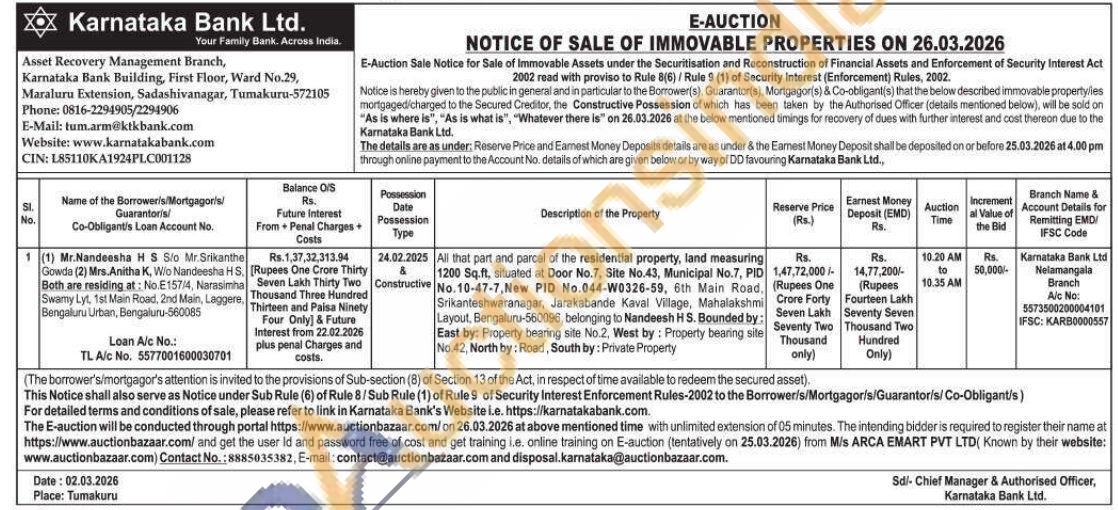 All that part and parcel of the residential property, land measuring 1200 Sq.ft, situated at Door No.7. Site No.43, Municipal No.7, PID No. 10-47-7, New PID No.044-W0326-59, 6th Main Road, Srikanteshwaranagar, Jarakabande Kaval Village, Mahalakshmi Layout, Bengaluru-560096, belonging to Nandeesh HS. Bounded by: East by: Property bearing site No.2, West by: Property bearing site No.42, North by: Road, South by: Private Property