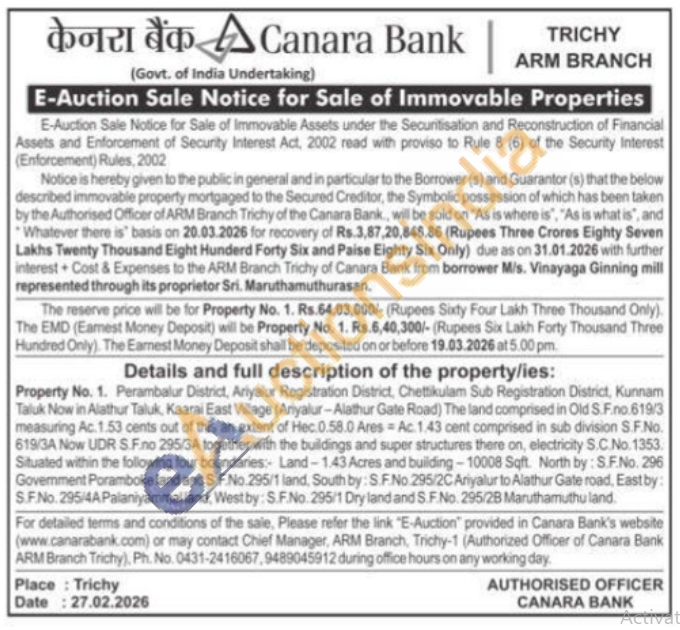 Property No. 1. Perambalur District, Ariyalur Registration District, Chettikulam Sub Registration District, Kunnam Taluk Now in Alathur Taluk, Kaarai East Village (Ariyalur-Alathur Gate Road) The land comprised in Old S.F.no.619/3 measuring Ac. 1.53 cents out of this an extent of Hec 0.58.0 Ares Ac. 1.43 cent comprised in sub division S.F.No. 619/3A Now UDR S.F.no 295/3A together with the buildings and super structures there on, electricity S.C. No. 1353. Situated within the following four boundaries: Land-1.43 Acres and building-10008 Sqft. North by: S.F.No. 296 Government Poramboke land and S.F.No.295/1 land, South by: S.F.No. 295/2C Ariyalur to Alathur Gate road, East by: S.F.No. 295/4A Palaniyammal land, West by: S.F.No. 295/1 Dry land and S.F.No. 295/28 Maruthamuthu land